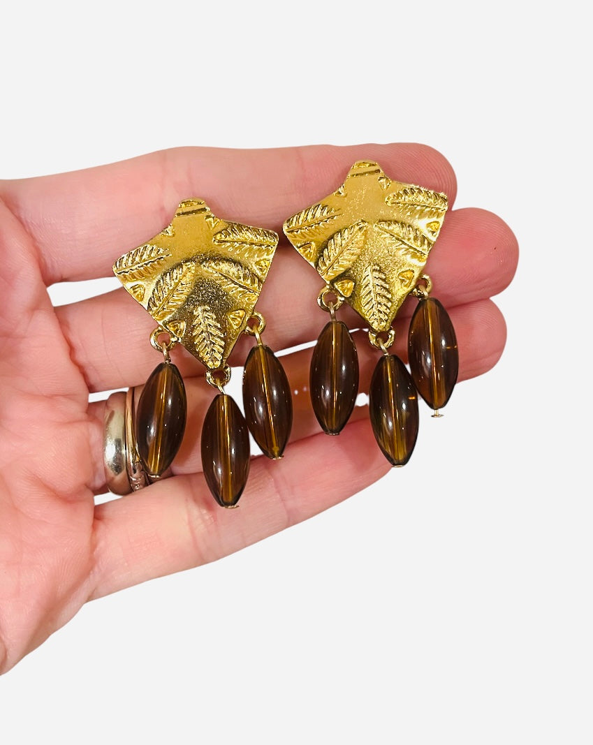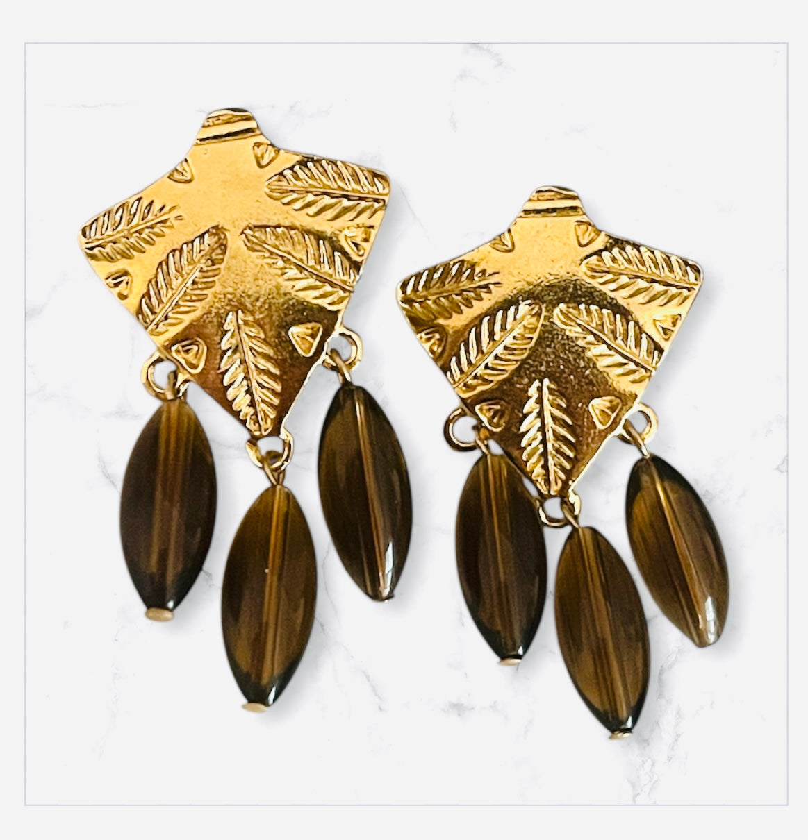Gold posts with unusual leaf design and long pearl or brown drops. Stunners!